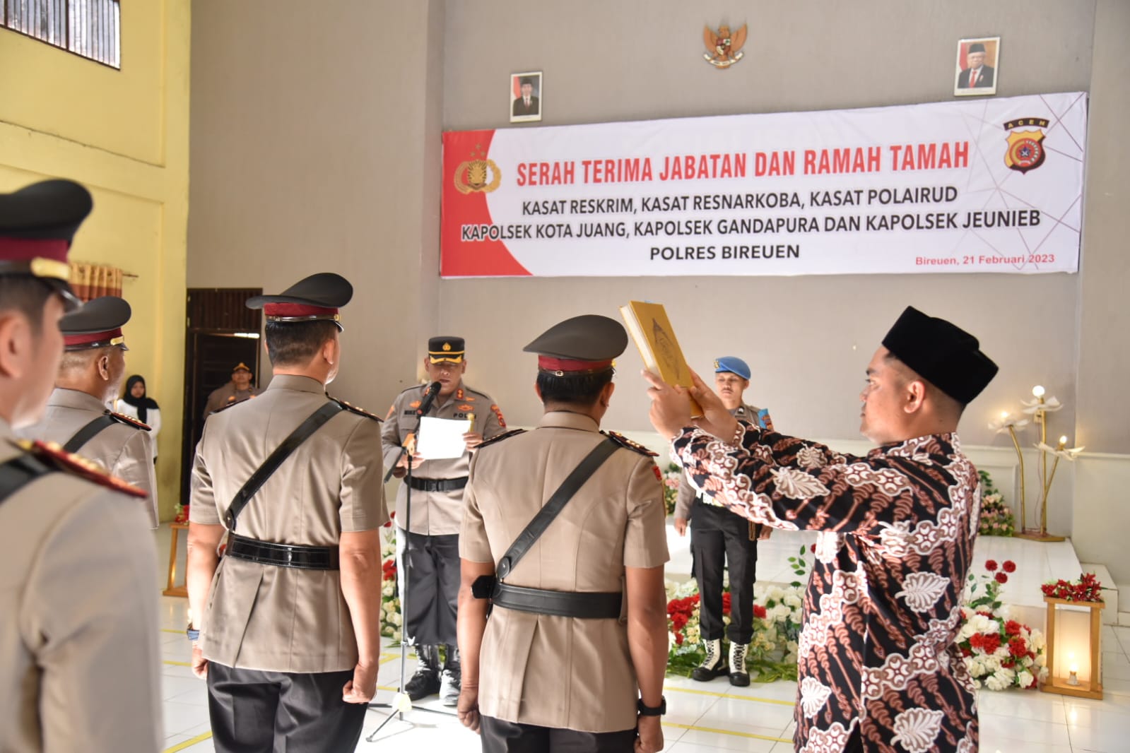 BIREUEN — Kapolres Bireuen AKBP Mike Hardy Wirapraja memimpin upacara serah terima jabatan (sertijab) Kasat Reskrim, Kasat Resnarkoba, dan Kasat Polairud di Aula 93 Pesat Gatra Polres Bireuen, Selasa, 21 Februari 2023.